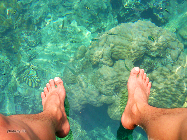 Perjalanan dilanjutkan ke lokasi snorkeling pertama yang tak jauh dari pelabuhan pulau Tunda. Sebelumnya, ikan pecak, ikan goreng, kerupuk ikan, dan sambal goreng menjadi menu santap siang di atas kapal. Nikmat! Di spot snorkeling pertama ini kondisi air cukup jernih. Ber-snorkeling dengan ditemani ubur-ubur kecil, yang terkadang menyengat dan membuat sedikit gatal, tak menyurutkan niat menikmati keindahan bawah air pulau Tunda.