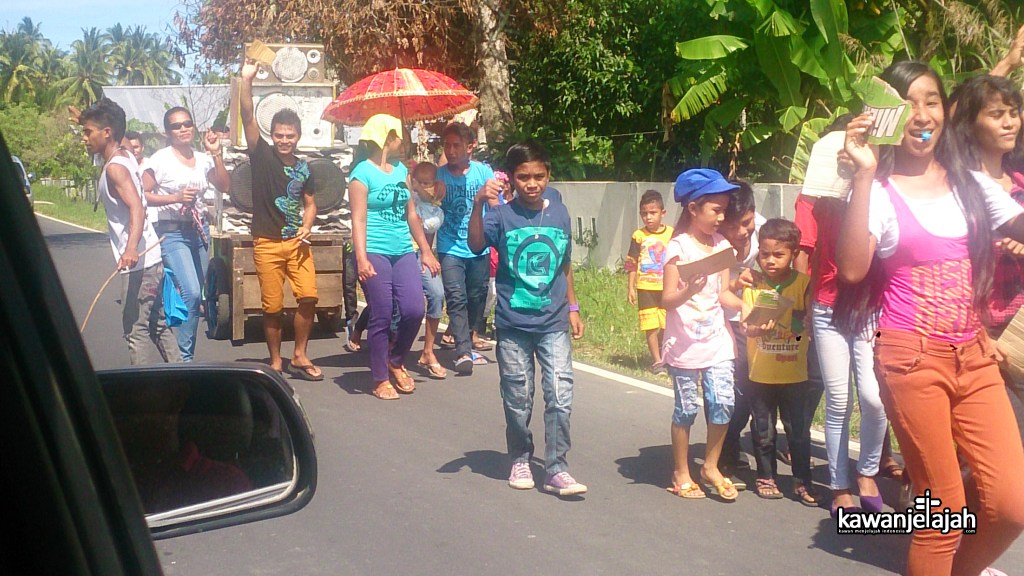 Saya sempat melewati beberapa titik keramaian saat perjalanan ke Tobelo kemarin. Tidak hanya diletakkan di depan rumah, speaker-speaker tersebut juga di bawa dengan gerobak atau mobil bak terbuka. Berkeliling diikuti rombongan yang menari-mari di jalanan. Raronggeng, itu kata Pak Seba untuk tarian-tarian yang dilakukan masyarakat. Tidak jarang dua rombongan bertemu dan adu keras suara.